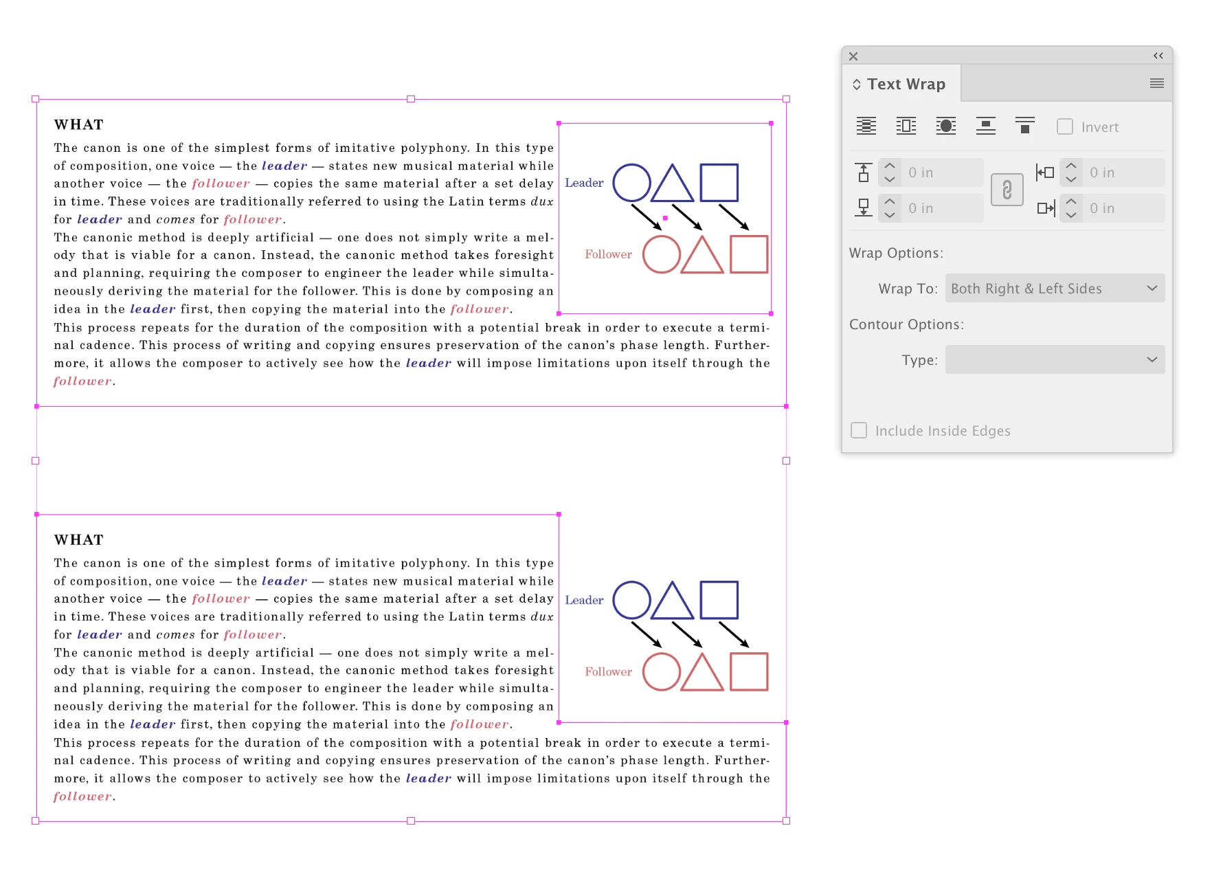 You can add text wrap to the placed object (top screen shot) or if the objects are pasted vector objects, you can create an invisible rectangle and apply text wrap to that. Another less common method is to add anchor points to the text frame to change its shape (bottom screen shot).