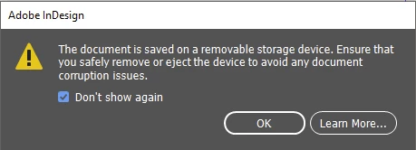 Since the latest update of InDesign (ver 18.2.1) I'm seeing a popup every time I Save or Save As to a "removable storage device".