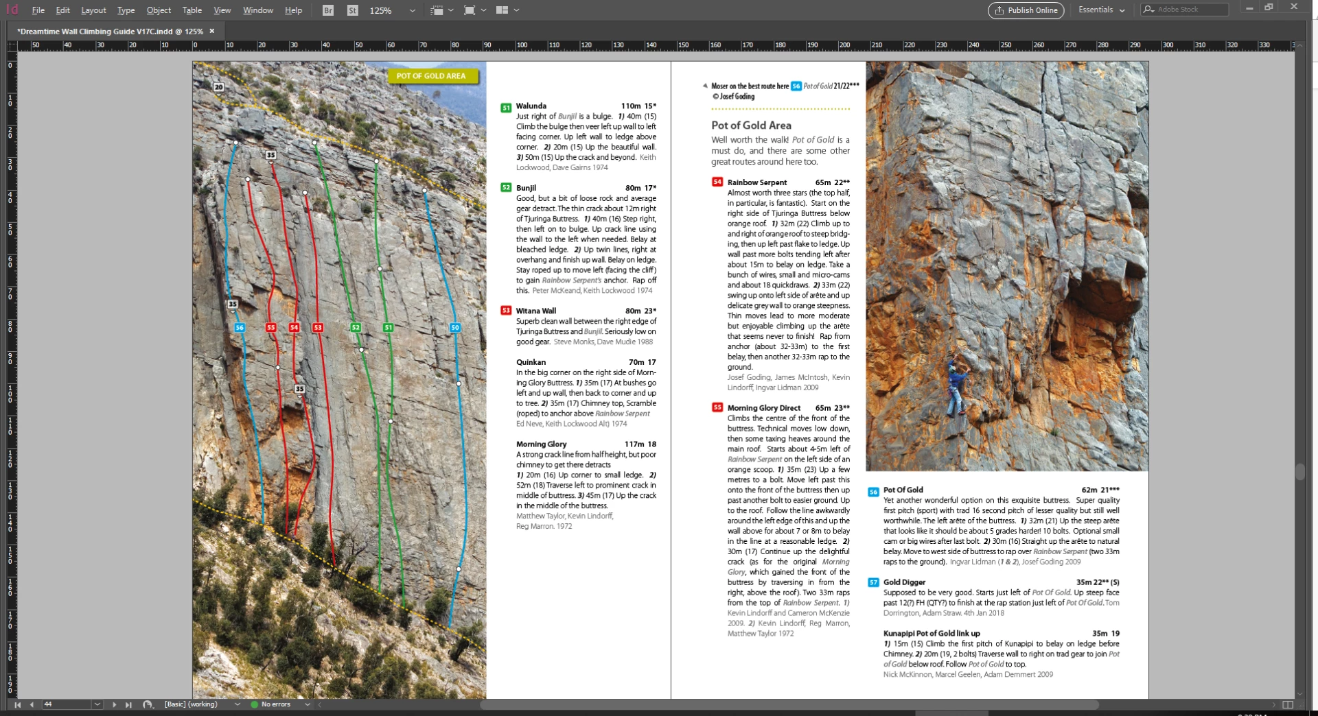 I have formatted the first line (route name, length, grade, stars) with a paragraph style, and can generate a table of contents with the page number and this line of text, which is great, but... the new Moonarie (South Australia) book is going to be around 1500 climbs, so manually separating/formatting the spacing between the route name ("Pot of Gold"), route length (62m), grade (21) and number of stars (***) is going to take FOREVER. I also need to work out a way to grab the area (which is a paragraph style header currently).