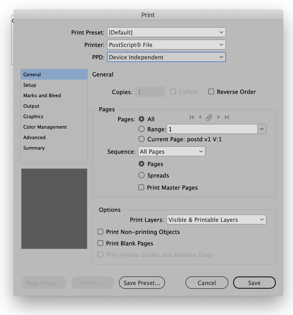 When I print, I print 99.9% of my InDesign files with a Samsung Laser Printer. This laser printer is set as the system default printer, and is always chosen first by TextEdit, Mail, Safari, etc. But every time I go to print from InDesign, I get the Print box as shown.