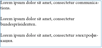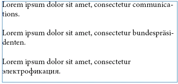 And if I change the language to "Russian", InDesign hyphenate the Russian word "электрофикация" and the English word "communications", but not the German word "bundespräsidenten":