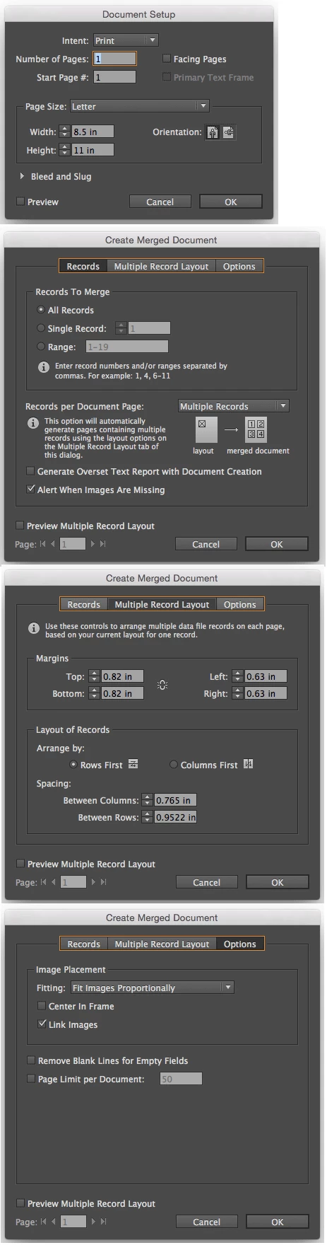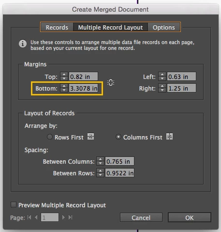 I have an InDesign file set up to create 6-up name badges using data merge with a comma delimited file (first name, last name, organization). Margins and spacing are set up to match the template of special diecut synthetic paper on which we print the badges. When I create the merged document, regardless of whether I'm arranging by rows or columns, the next two badges after the placed six on a page run off the page as shown in the screenshots below. Previous messages on this issue dating back several years don't seem to offer a working resolution. If anyone has knowledge in this area (or could examine my files at Dropbox - Name_Badge_template_issue.zip , I'd greatly appreciate the help.  Thank you. --cg