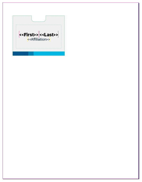 What Avery template number are you using? Make a frame the size of the badge, then group the art and text holder with this frame. Then position the group in the upper left hand corner. In the Merge panel, the margins will match the margins of the Avery template, and the spacing will match the gutters of the label as well.
