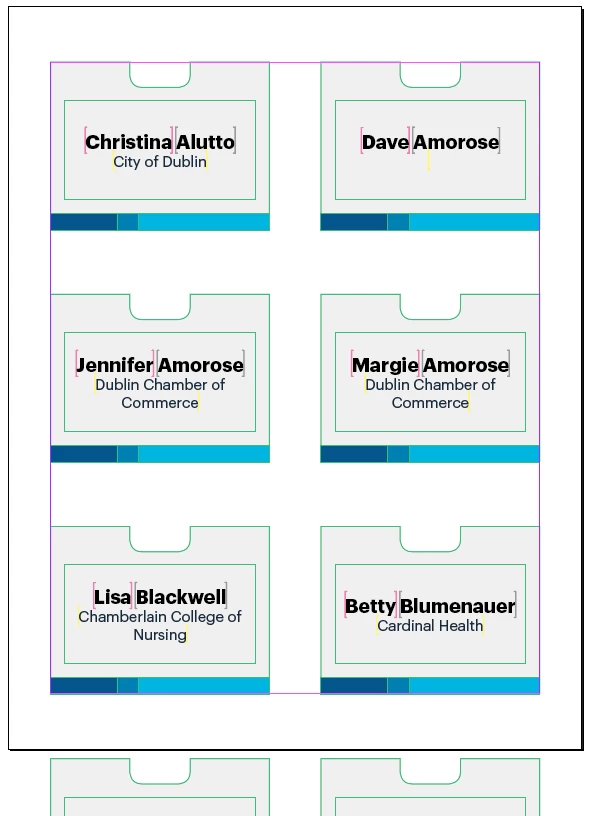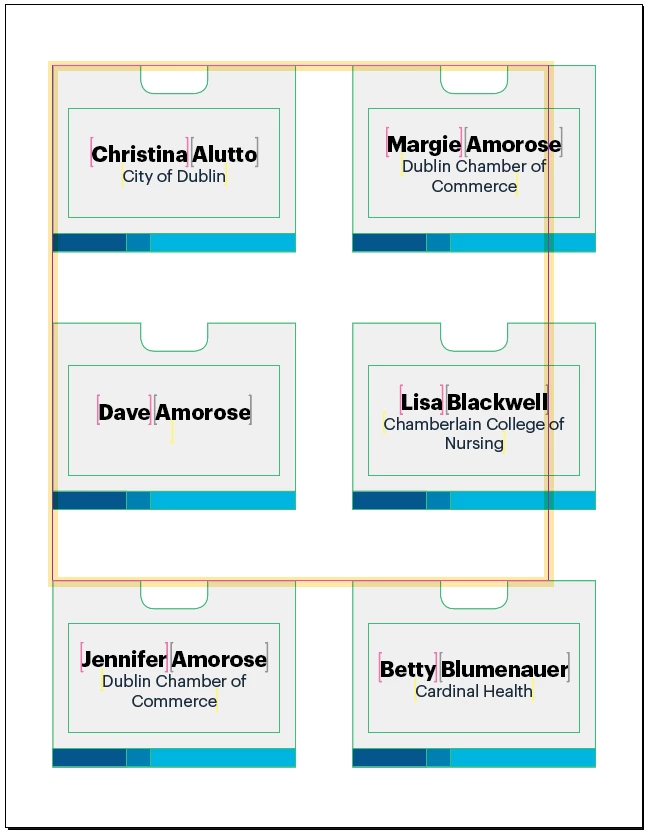 6-up name badge template with data merge: Items run off page