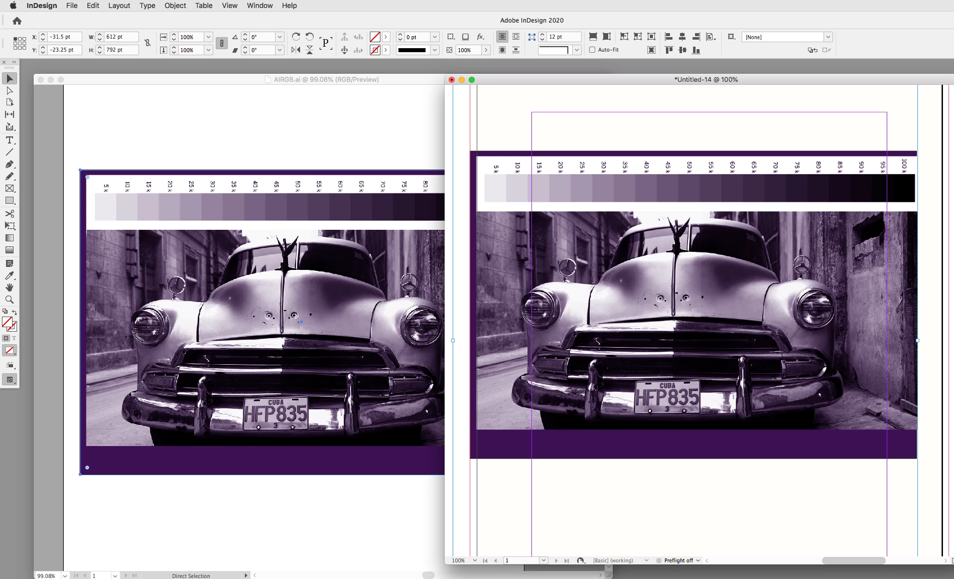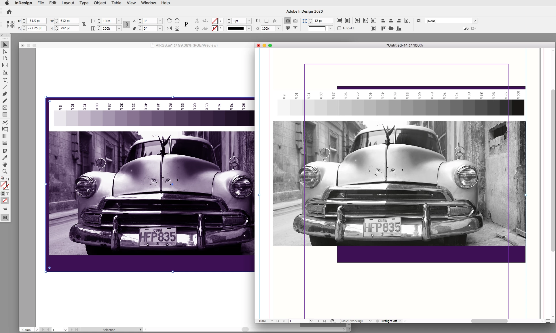 I have run into a problem where whenever I edit an image with Adobe Illustrator and try placing the file in InDesign, the colors won't show up. I am designing for a work project and the way the organization styles their pictures is by converting the original picture to black and white then adding a fill layer on top with a soft light blending mode. I have tried saving it both as a PDF/X-4 file and an AI file and whenever the pictures are placed in InDesign the colors will only show up if it is low resolution, but not high quality, and then once I export the indesign file the colors once again do not show up in the final PDF file. I have attached two screenshots-- one with the color in "typical display" mode and one without color in "high quality display" mode. Is there a way to get the soft light blending mode to show in InDesign? Please help.