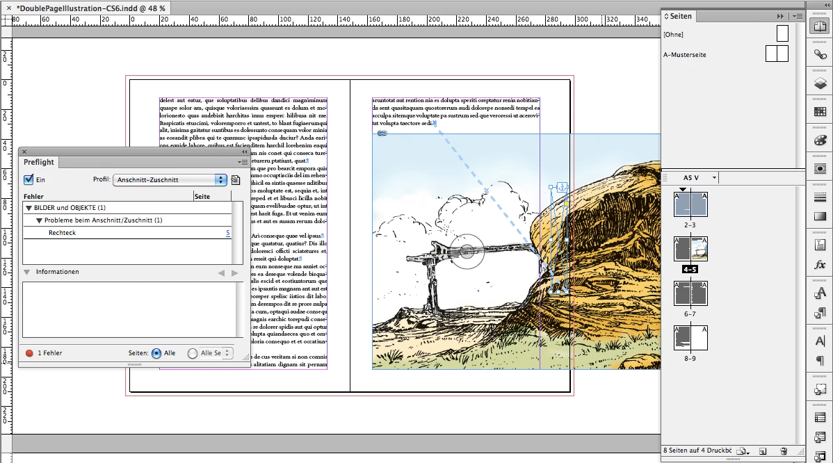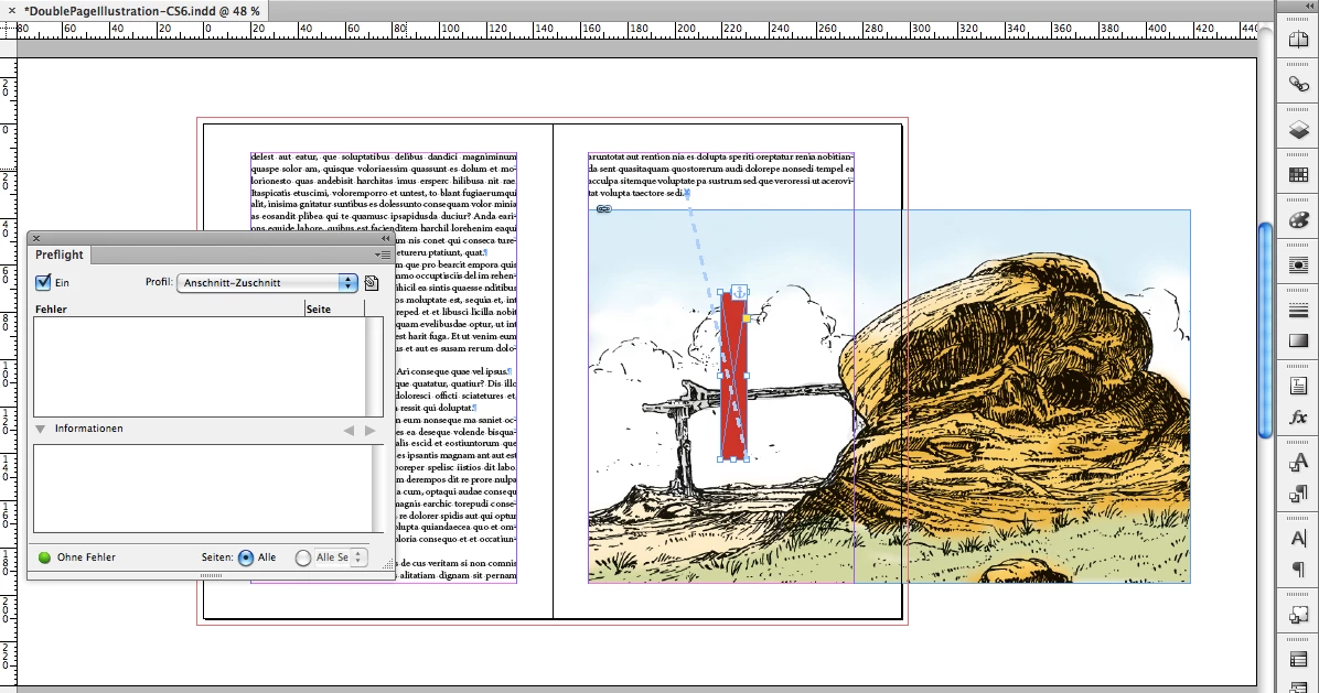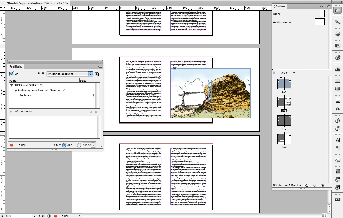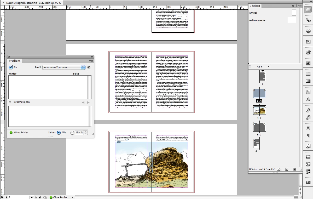 1. Illustration on facing pages. No error in preflight.