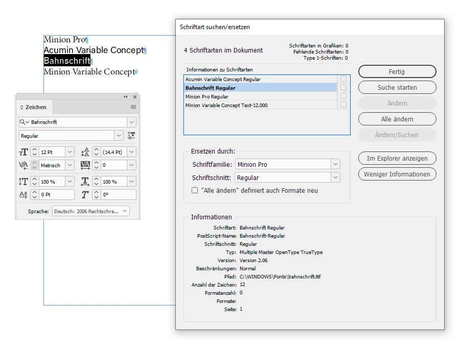 If it fails in your case, please do a screenshot of the dialog Type > Find/Replace fonts…, select the font and look into "More Information" what the details are ( screenshot from my German InDesign 2021 ) :