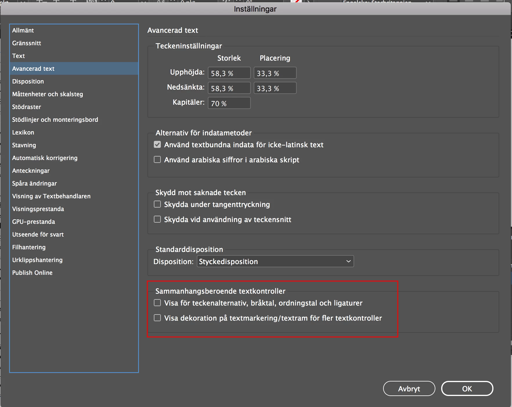 - deactivated the two bottom checkboxes (in all 4 possible configurations) in the "advanced text"-meny under InDesign preferences (I'm on a Swedish version of the program so I don't know the correct english name for these boxes: "Sammanhangsberoende textkontroller" in Swedish, se pic below).