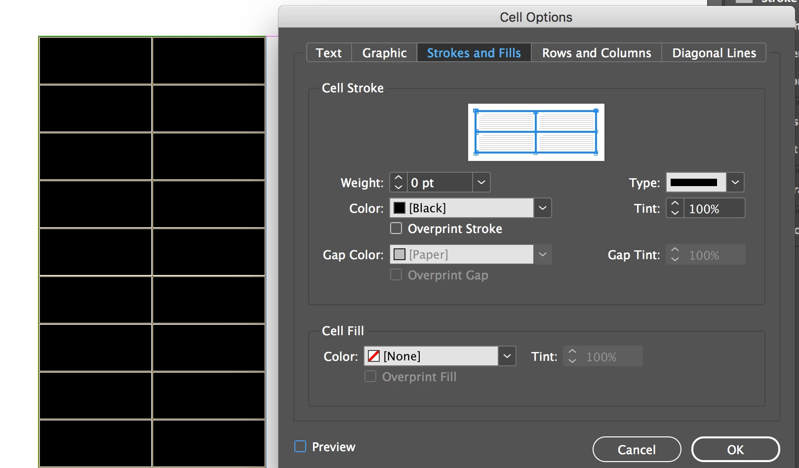 I would like to present a small table (2 cols x 9 rows) without any lines. In Table Setup I set the Body Border weight to zero. However, I have forgotten how to 'zero-out' the cell borders. That option does not appear (or at least, I cannot find it) under Table | 'Table Options' or Table | Cell Options.