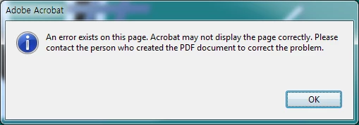 Then the file has problem with "An error exists on this page. Acrobat may not display~" pop up on specific pages.