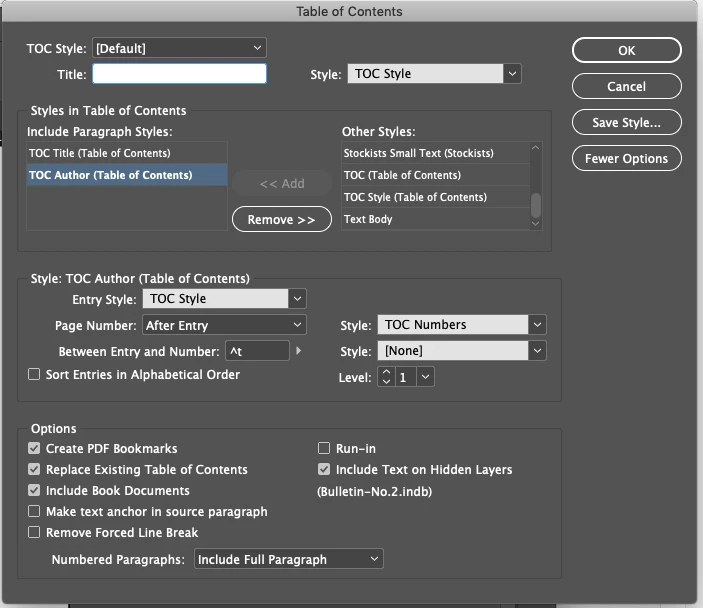 Here is the dialog. For each file within the book, I have defined Paragraph Styles for "Title" and "Author" and selected them both under "Include Paragraph Styles"