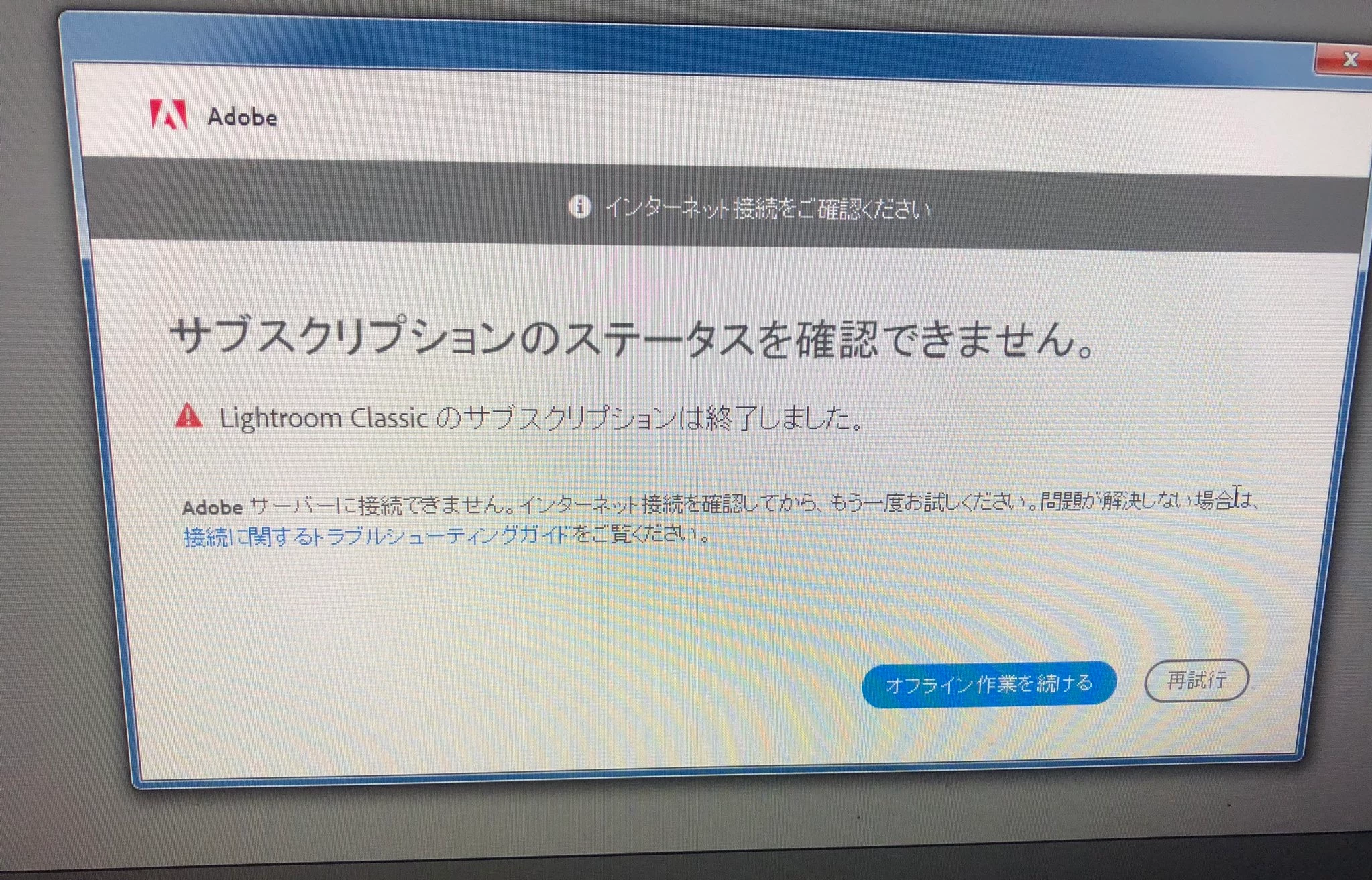 Lightroom Classicを起動したところ突然このような画面が出るようになってしまい、現像作業が出来ない状況になりました。