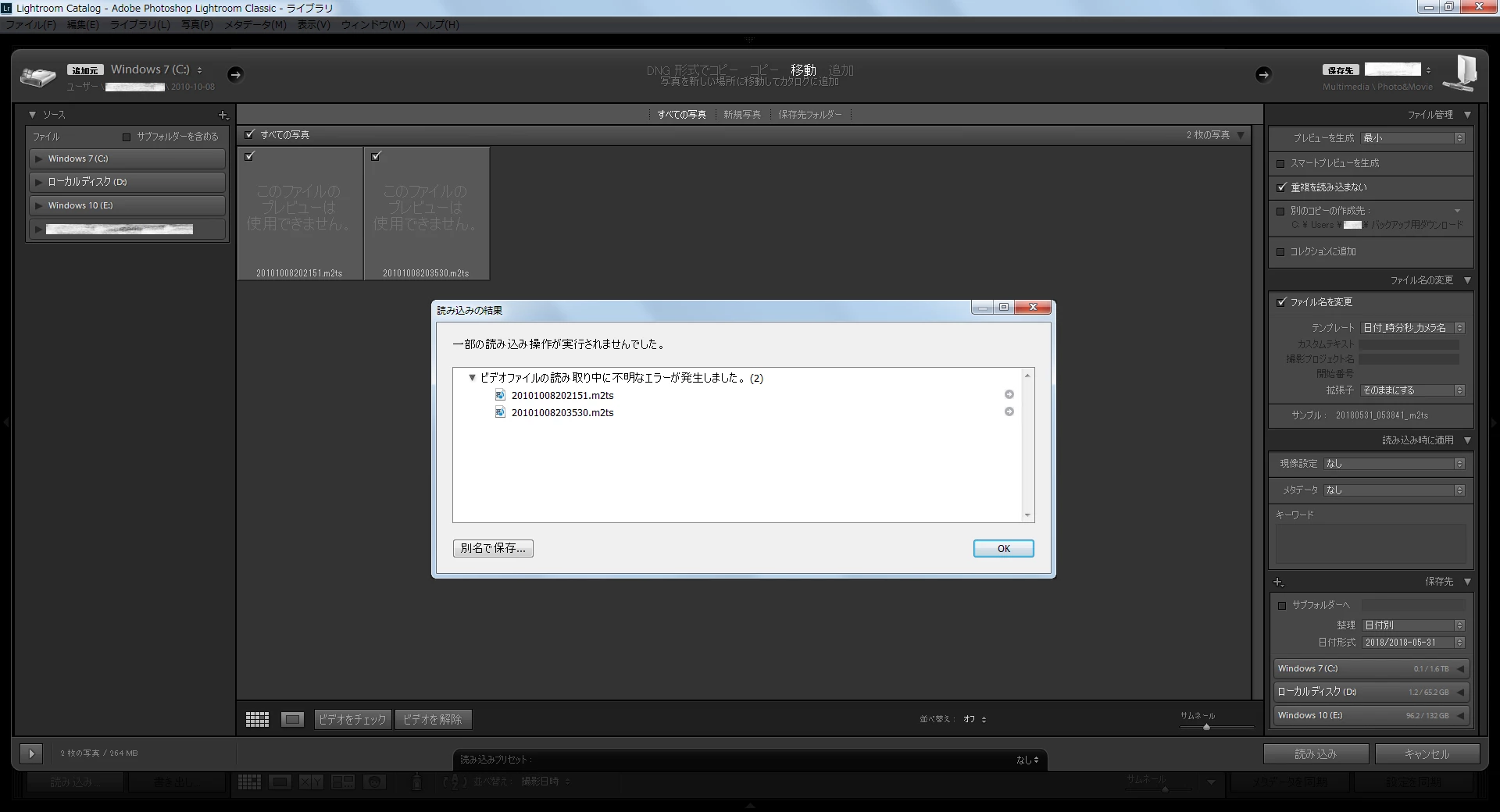 lightroom classic ccでm2tsの動画ファイルを読み込もうとしても添付画像のようになって読み込めません。