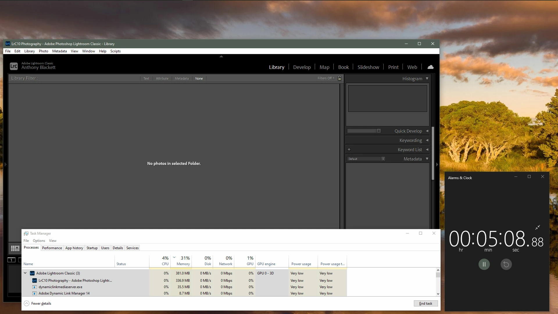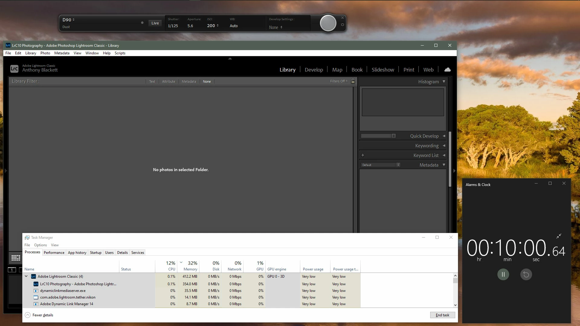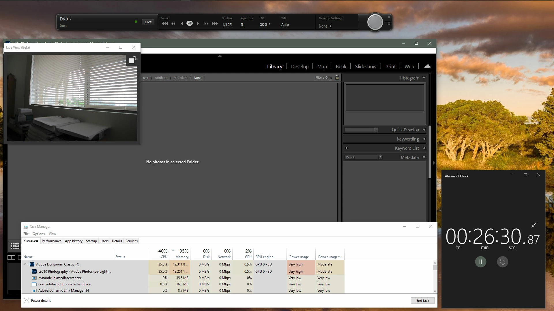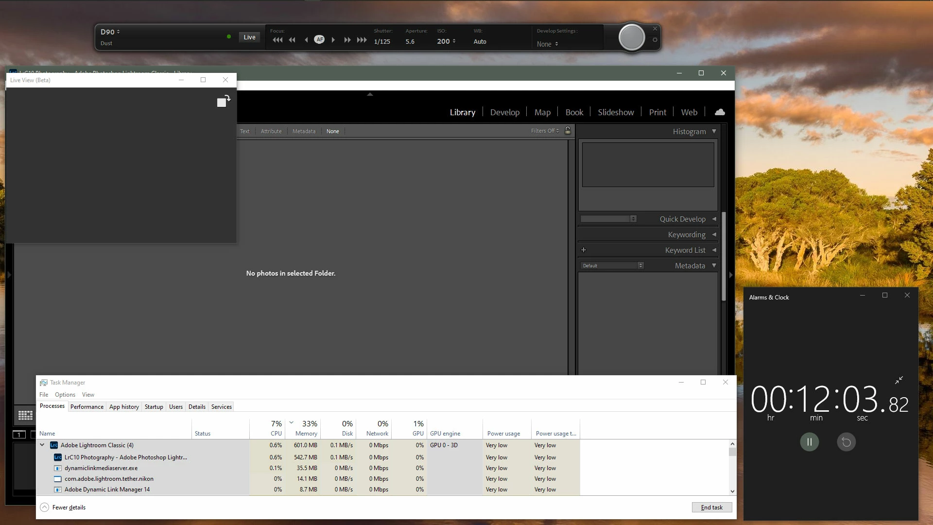 Now things get very bad. Leaving LrC in Live shooting mode while doing nothing else (no exposure settings changed, no shots taken), memory usage rapidly climbed at an astonishing rate, and after 10 minutes had passed, LrC had taken over 10.8GB.