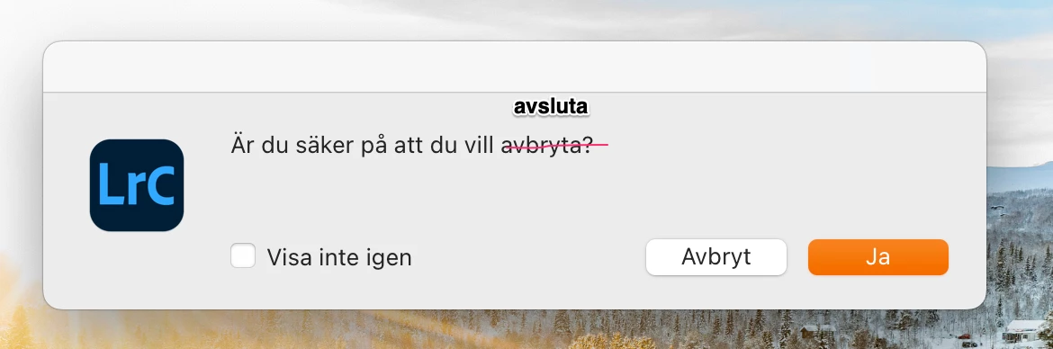 Every time I am about to quit Lightroom, I stare irritated at the screen. Someone has decided to translate ”quit” into the Swedish word ”avbryta”. It should be ”avsluta”.