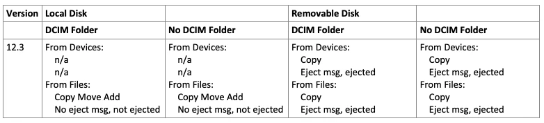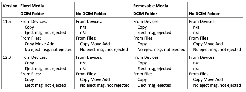 Lest you doubt any of this, these tables show the results of exhaustive testing of Import, using an external USB disk drive for Fixed Media / Local Disk and a USB thumb drive for Removable Media / Removable Disk: