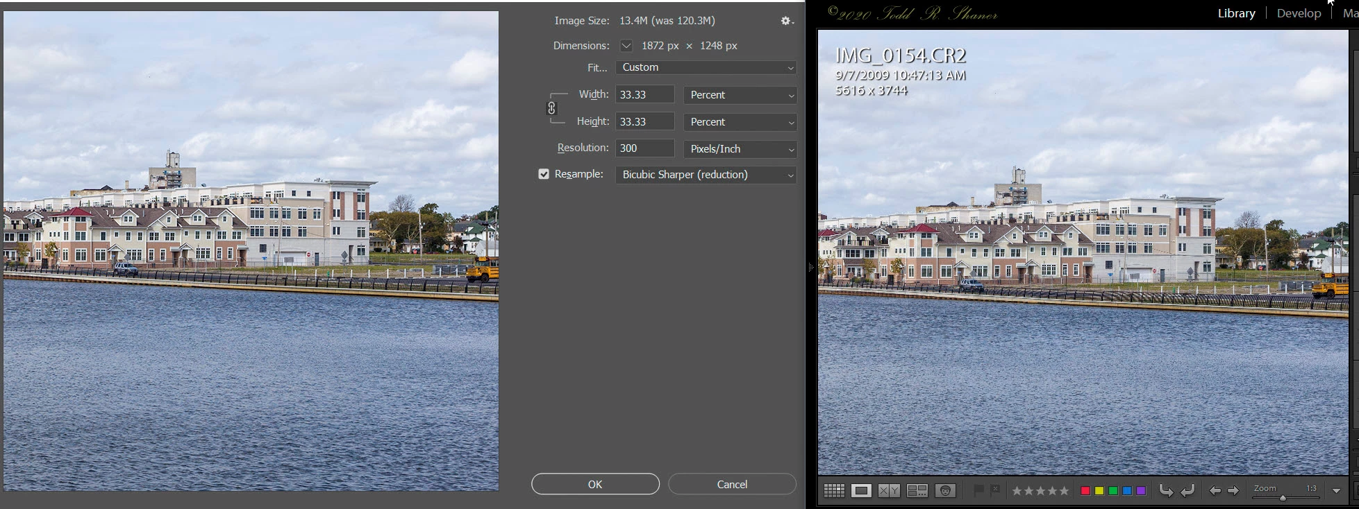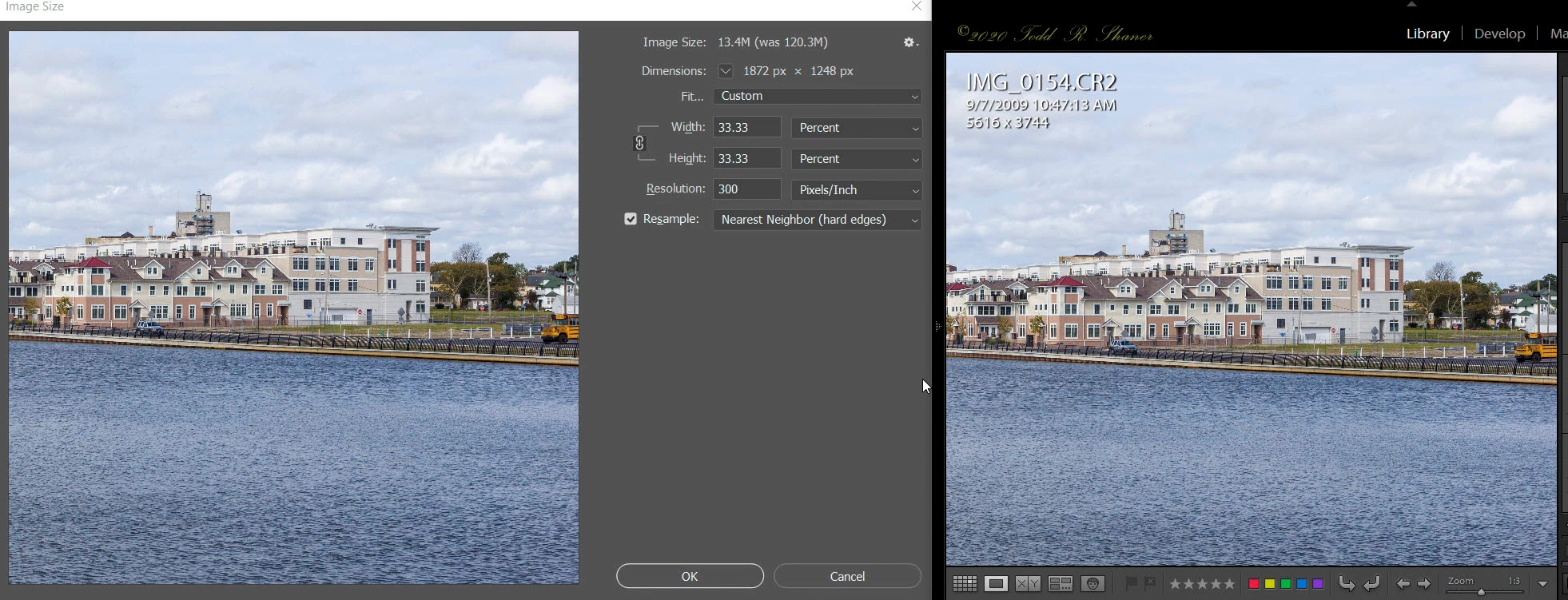 What this means is that the ALL of the Library Zoom view settings less than 1:1 may exhibit artifacts with certain image files that appear as edge "jaggies' or moire' patterns. This makes them less useful for evaluating the image detail at Zoom settings of resized export and print output. Here are examples using Lightroom Classic 9.3 showing PS Image Size panel with 33.33% (1:3 Zoom) image resizing using Nearest Neighbor (top screenshot) and Bicubic Sharper (bottom screenshot) Resample algorithms.