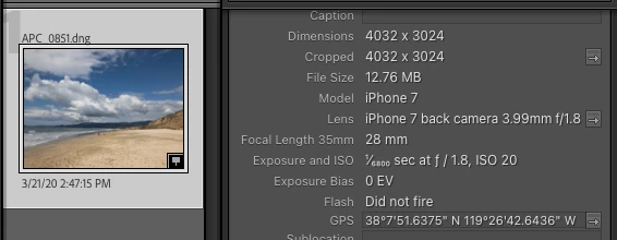 1. Import this DNG and observe in the Metadata panel that it has GPS coordinates: