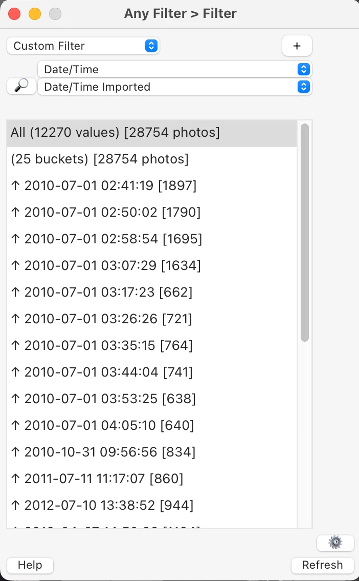 I may display all pictures in my library by "Added Order". Is there any way to display files imported on a particular date? I was trying Smart Collection but it is not allowing that possibility what I want