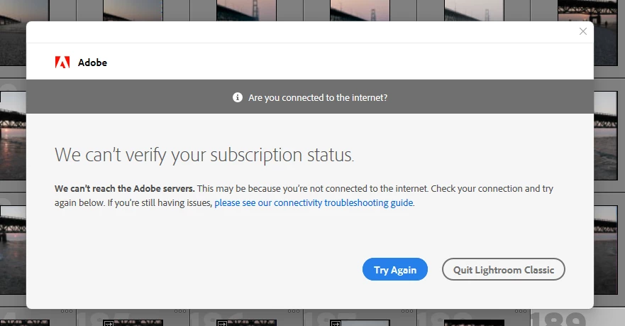 None of the Adobe Applications, Photoshop, Lightroom or LRC cannot verify the subscription service. Creative Cloud connects and updates without issue. It just seems to be the other Adobe Desktop applications. I have no issues with any other program. Disabled firewall and anti-virus and still same issue.
