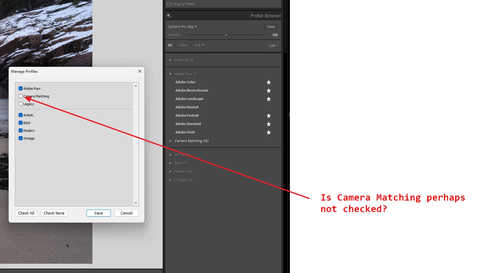 Hi guys! I just got my first Fuji camera, a GFX 50R. From what i understand lightroom should have camera matching profiles that match Fuji's film simulations in Lightroom but they dont show up in my profile browser? As you see in the screen grab its a fuji RAF file, which should have the camera matching profiles? Thanks for any help