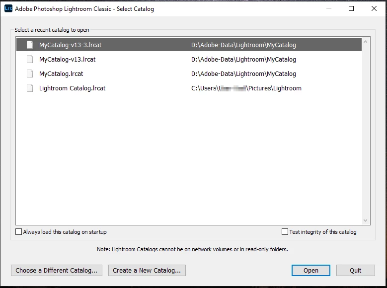 First select the appropriate recent catalog and let it check it – note the checkmark "Test integrity of this catalog" to check its integrity. If that doesn't help, try to create a new one and see if this catalog works. If yes, you could then try to import your current catalog into the new one.