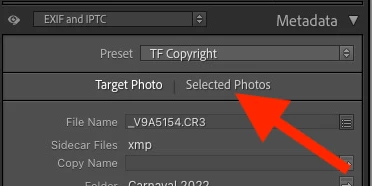 Ah, the screenshots clarify what's happening. You need to click Selected Photos in the Metadata panel: