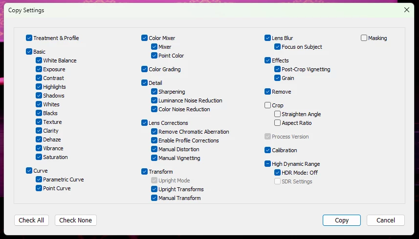Today I noticed Lightroom Classic not behaving as usual. When I open up the copy settings window, I have no option to actually copy the Remove Tool (Q) (previousy called healing brush).