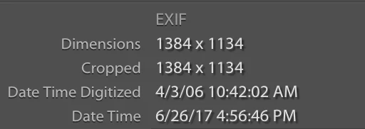 This is a photo that somehow had DateTime set to 6/26/17 when imported, and I changed the capture time (DateTimeCreated) using Lightroom's Metadata menu, to the correct date (4/3/06), which I know from other sources is the actual date the photo was taken.