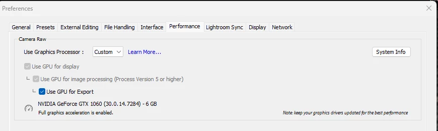 I downloaded the driver individually and performed a clean installation. I tried again with Lightroom, but no luck.