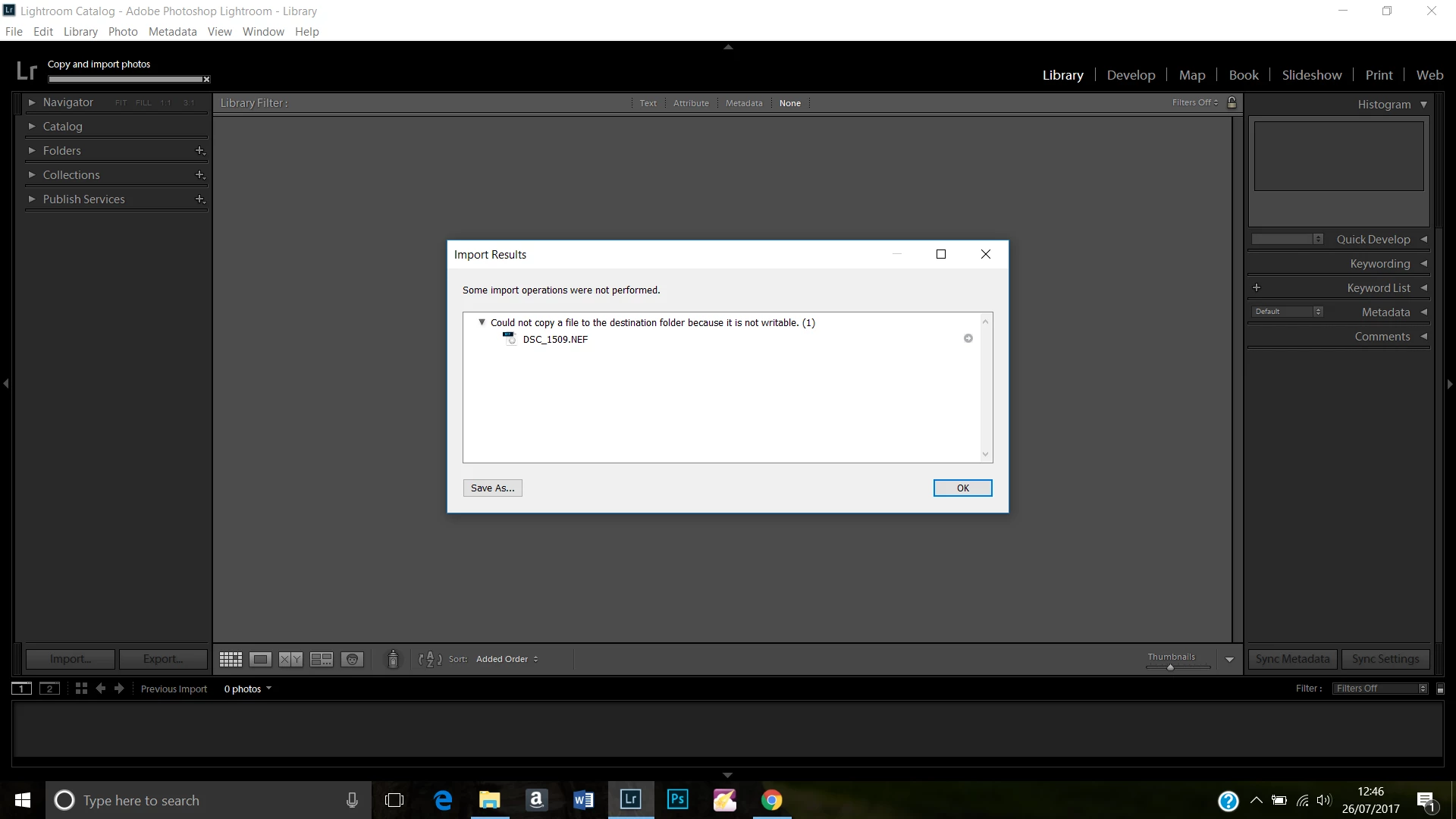 I have been having issues finding already imported images and folder problems so decided to remove them and start again. I am trying to import images to be hit with this message for every image type and every folder destination. What does this mean how do I fix this?
