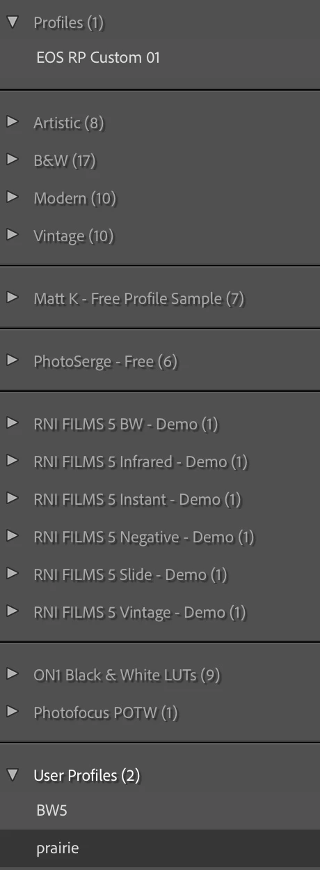 Here is a screenshot ofmy Profile browser panel on the right side of LR Develop module. I see three user profiles that don't even show up in Finder when I right-click Show in Finder.