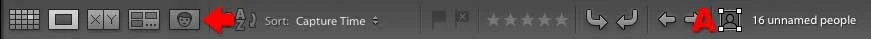 To select multiple faces and accept them all at once, Lightroom needs to be in People view (choose View > People). That's the grid view shown in my earlier post. You can also enter People view by clicking the button next to the red arrow below, in the Toolbar at the bottom of the window (if it isn't showing, press the T key). The view you've been in is Loupe (single image) view with faces highlighted, indicated by the icon next to the red A below.