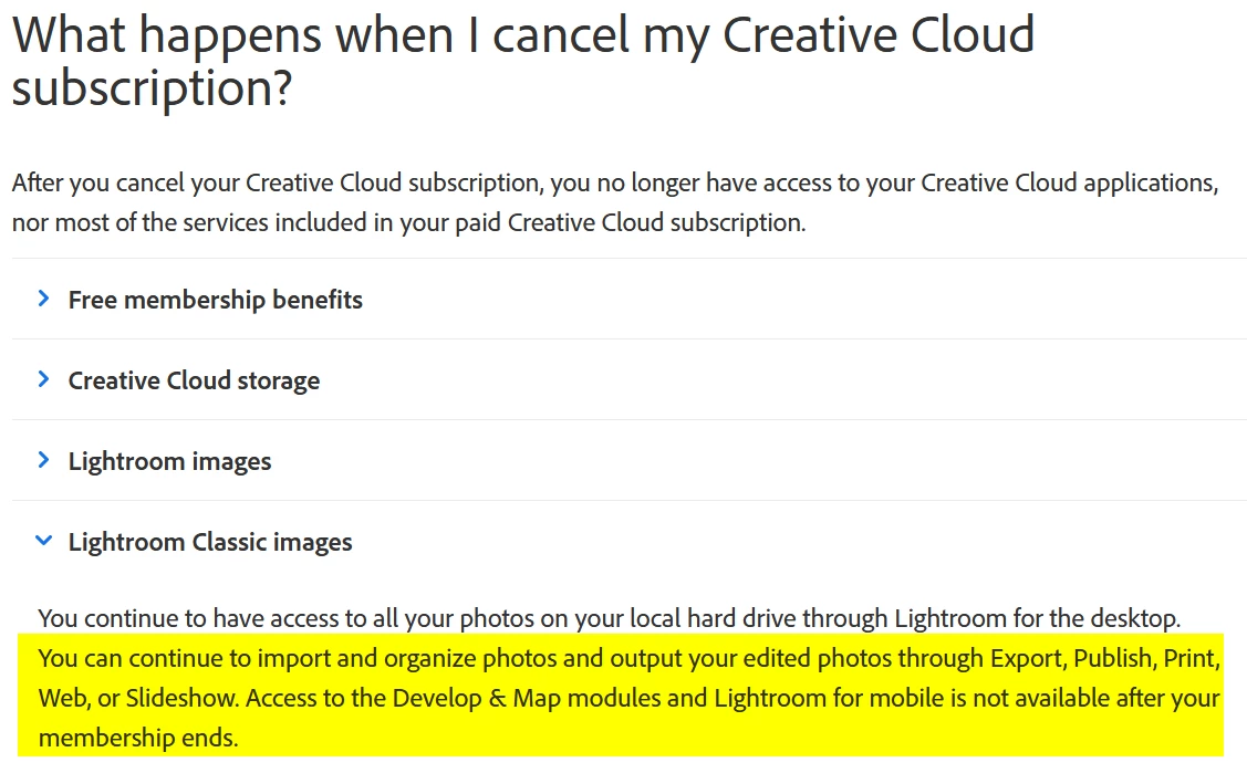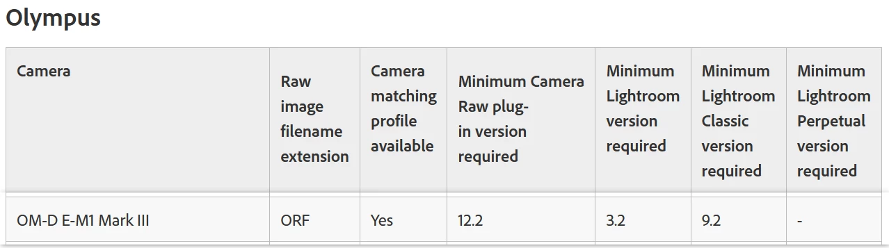 At the moment I have installed an old Lightroom Classic Desktop App v6.14 with a perpetual license. This worked fine with my old camera, but not with the new Olympus camera. From the compatibility list on the Adobe support sites I see that I need the following versions: