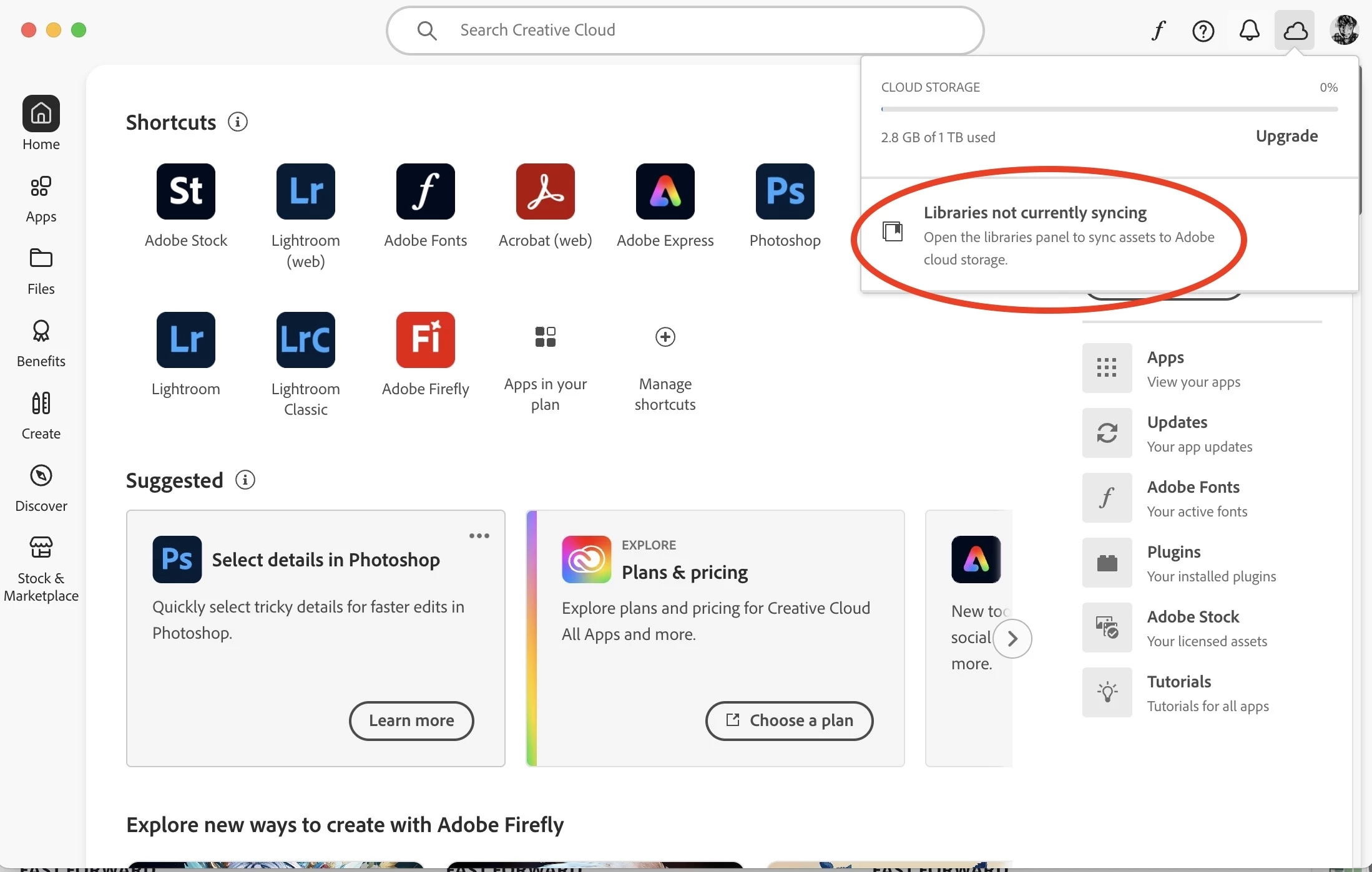 In my Creative Cloud app on my Mac it says "Libraries currently not synching. Open the libraries panel to synch assets to Adobe Cloud storage.