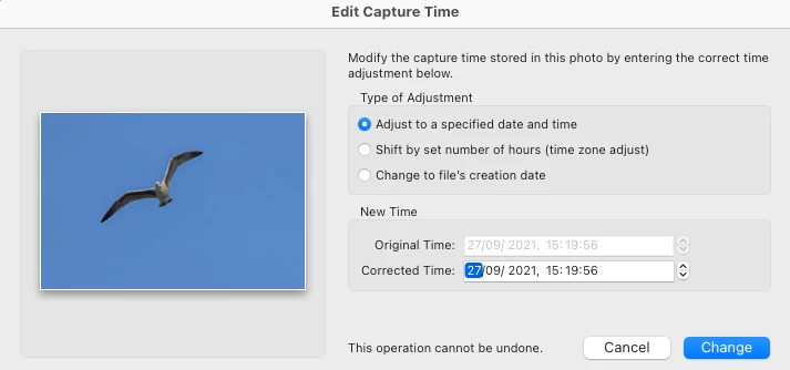 You're looking oin the wrong place. If you want to change the capture date/time, then use the menu option 'Edit Capture Time', which can be found under the Library Metadata menu. Below screenshot shows where you change the date and time, not the Edit Metadata panel.