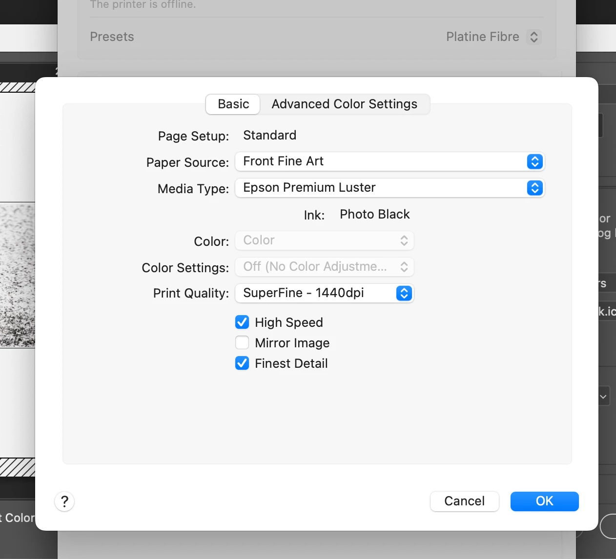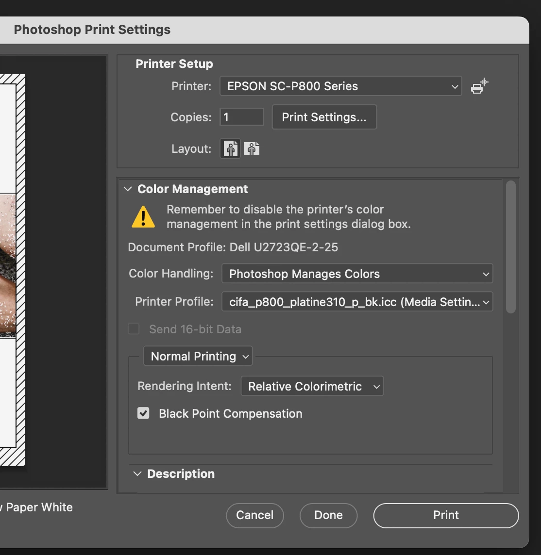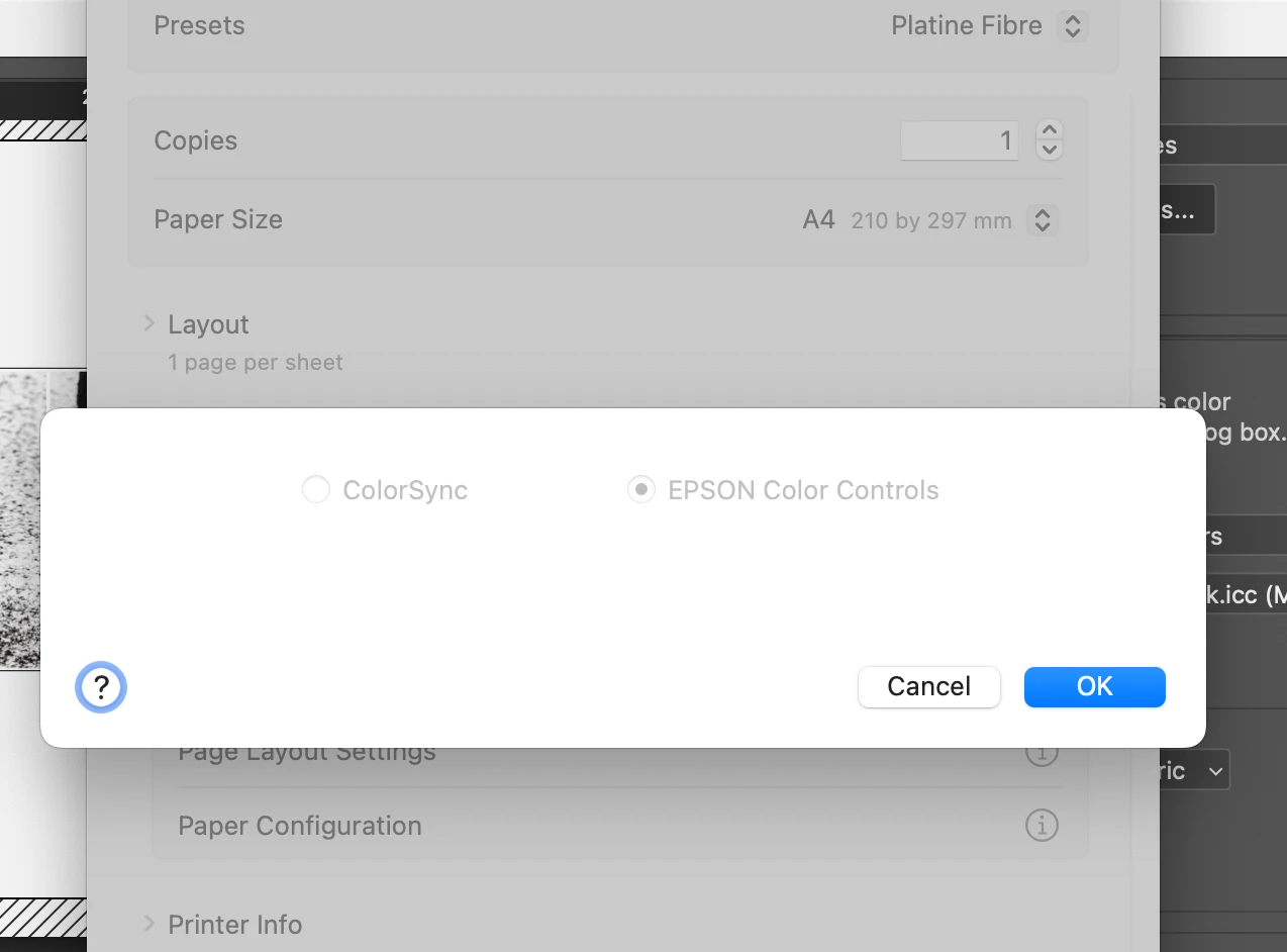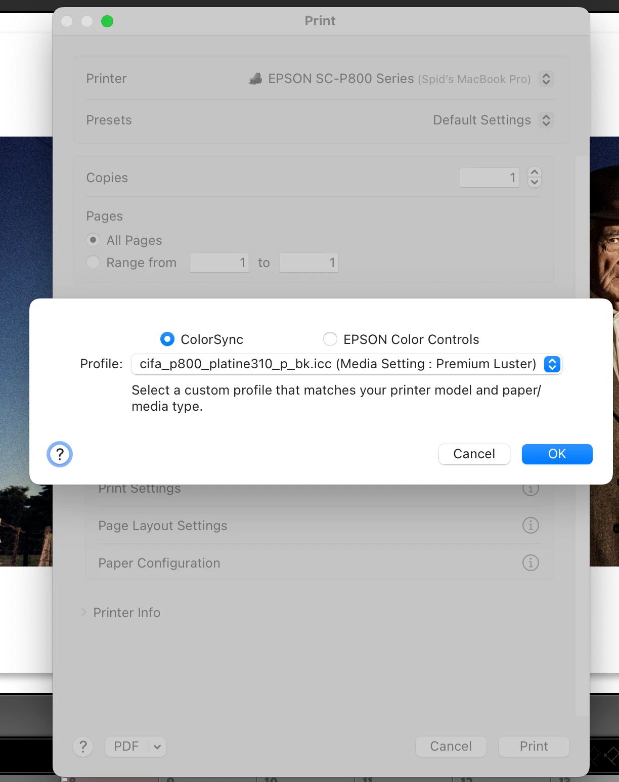 Has anyone got a solution for the printing issue that currently exists in LR and PS with the Epson injet printers? The problem is that there is no way of selecting your paper/printer icc profile in these programs and therefore epson color controls the color output, see screen shots below. I have uninstalled all adobe software and then deleted all epson software and then reinstalled it all. Any ideas how to fix? I'm using a macbook pro - sonoma and epson sure color p800 printer. The only solution I have come up with is to let the printer manage colors and then you can select colorsync and then select your icc profile.