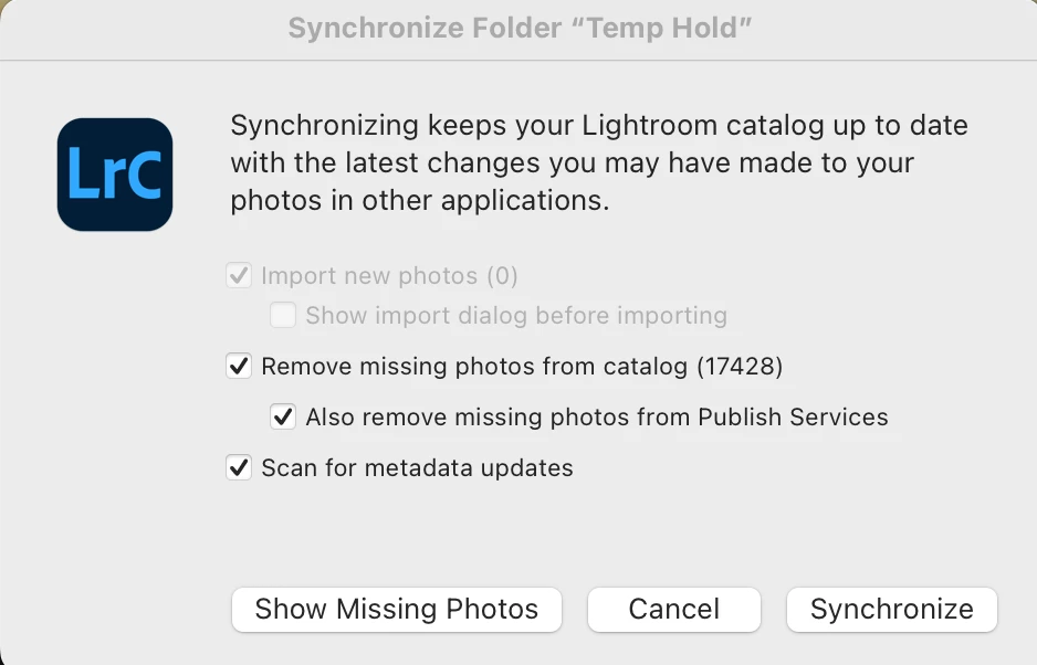 Lightroom Classic Synchronize Does Not See New Photos and Wants to Remove All Existing Photos