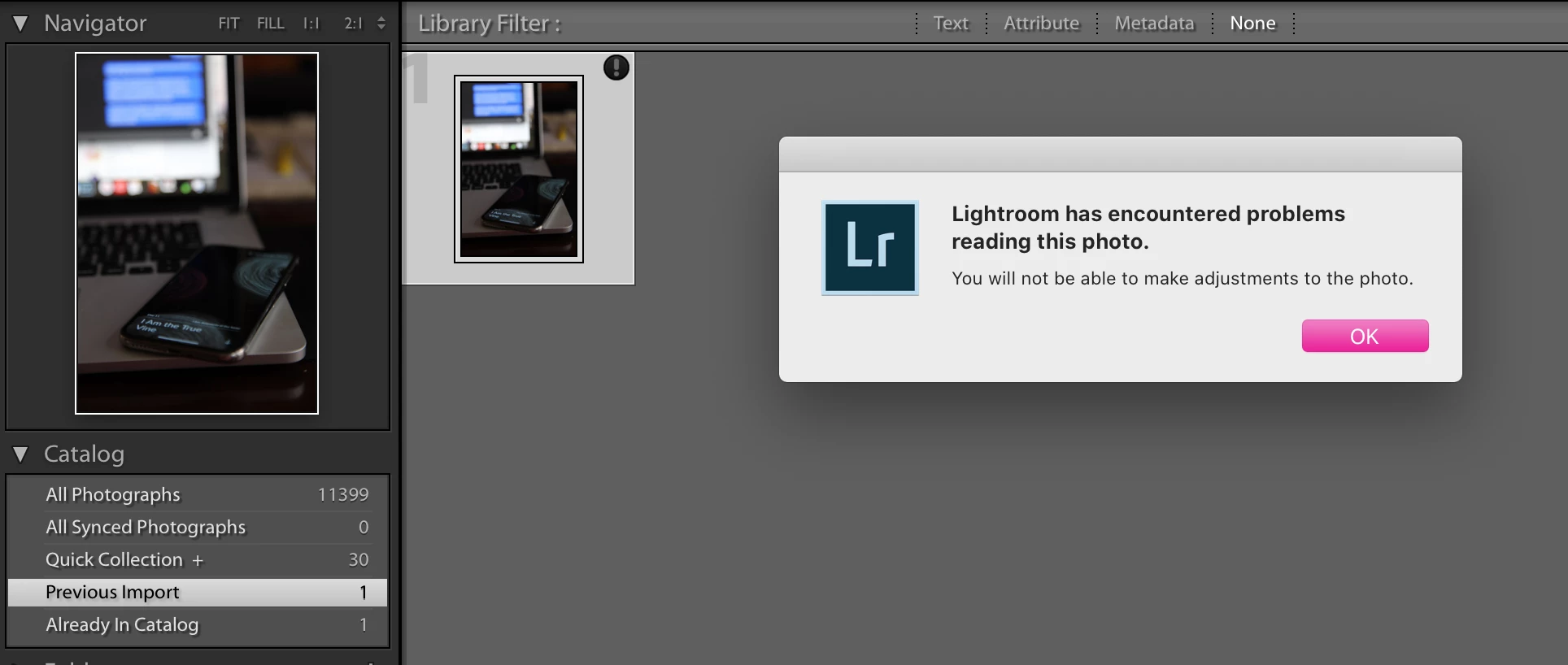 I have used LR for many years now and and well accustomed to troubleshooting when issues occur; however I can't seem to figure out what's going on here. Upon import, I keep getting the error message "Lightroom has encountered problems reading this photo. You will not be able to make adjustments to the photo." My RAW images are stored on my external hard drive and that is what I use to import photos. I just began having this issue right after I updated to the latest version of Lightroom Classic 9.0. Before updating I was not having this issue at all. I have tried restarting my computer and uninstalling and re-installing LR. I haven't moved any of my images, so it's not an issue of location. LR is able to locate my images.