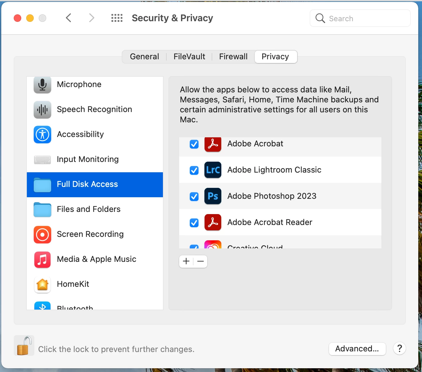 Lightroom, is gone in "Files and Folders" permission settings on Mac Ventura