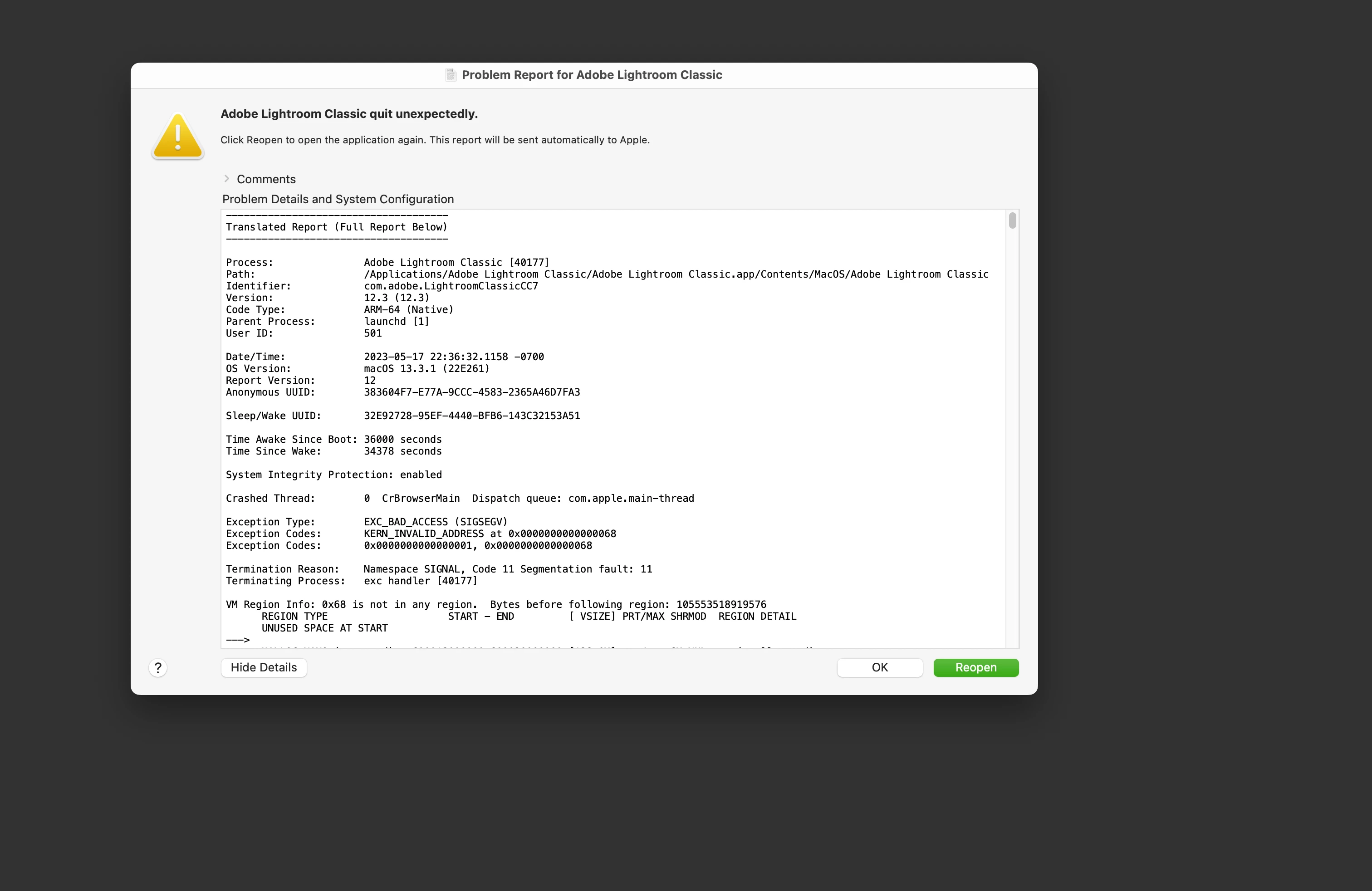 Lightroom Classic 12.3 is crashing (Macbook Pro, M1, Ventura).