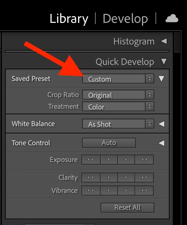 Library / Quick Develop / Saved Preset / Custom