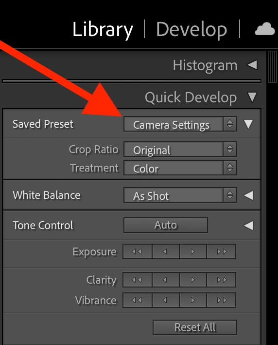 Library / Quick Develop / Saved Preset / Camera XYZ