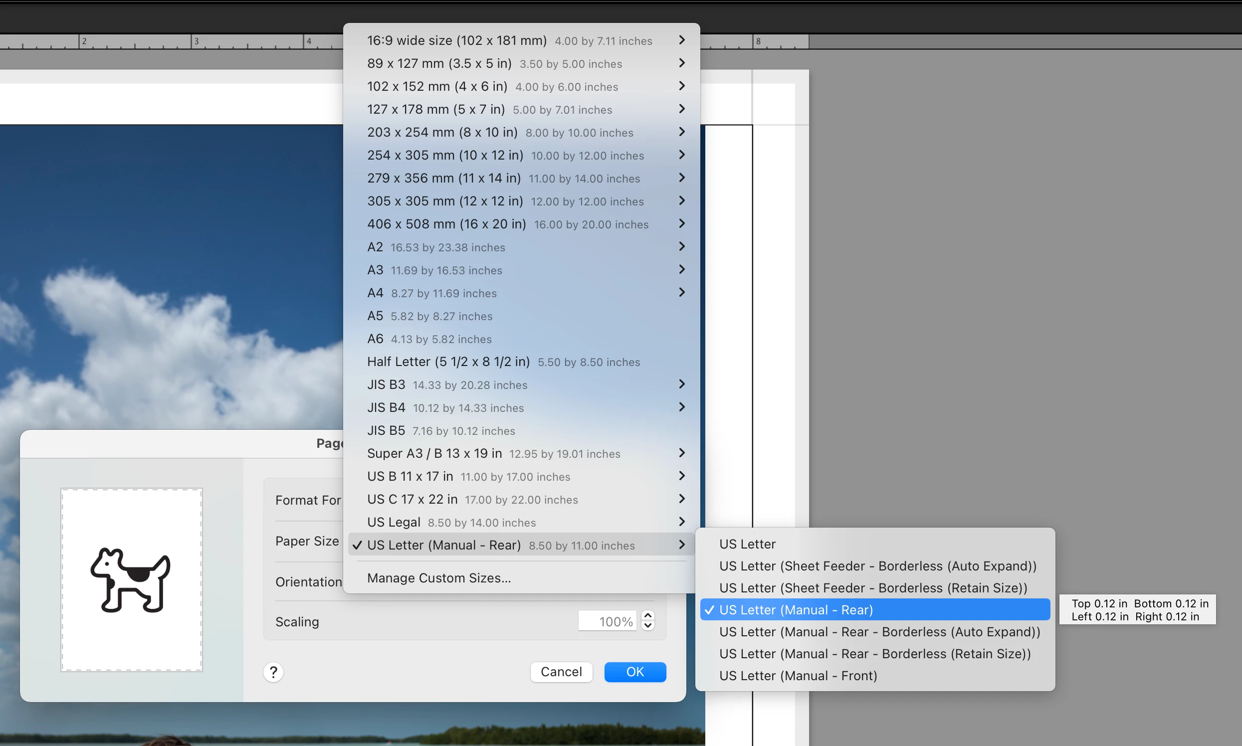 • Choose the paper size from the Page Size pop-up menu.