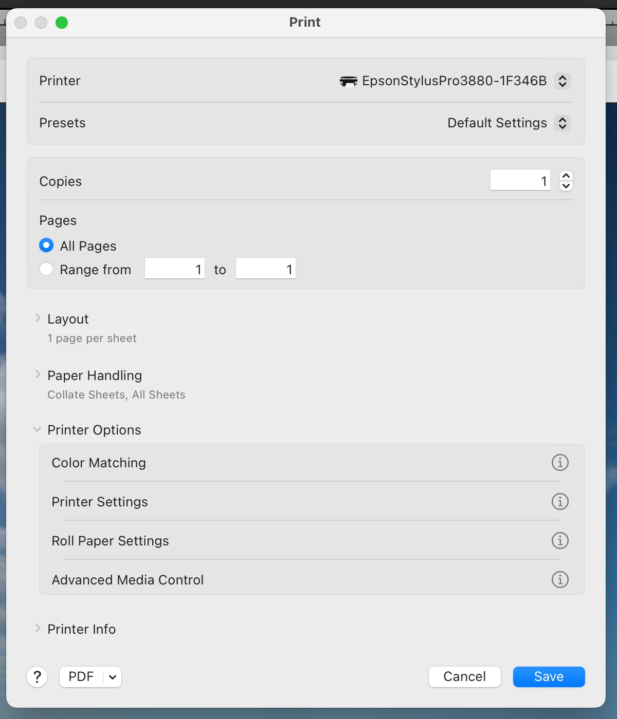 • Notice that the Preset is set to None. DO NOT change this. DO NOT use the Default Settings. If you change this all the settings you previously saved will be reset. For example, the default paper is a luster paper, which uses Photo Black ink. I was printing to a matte paper, which uses Matte Black ink. Choosing Default settings switches the ink, which causes the printer to switch the black inks, which is a waste of ink and not correct.