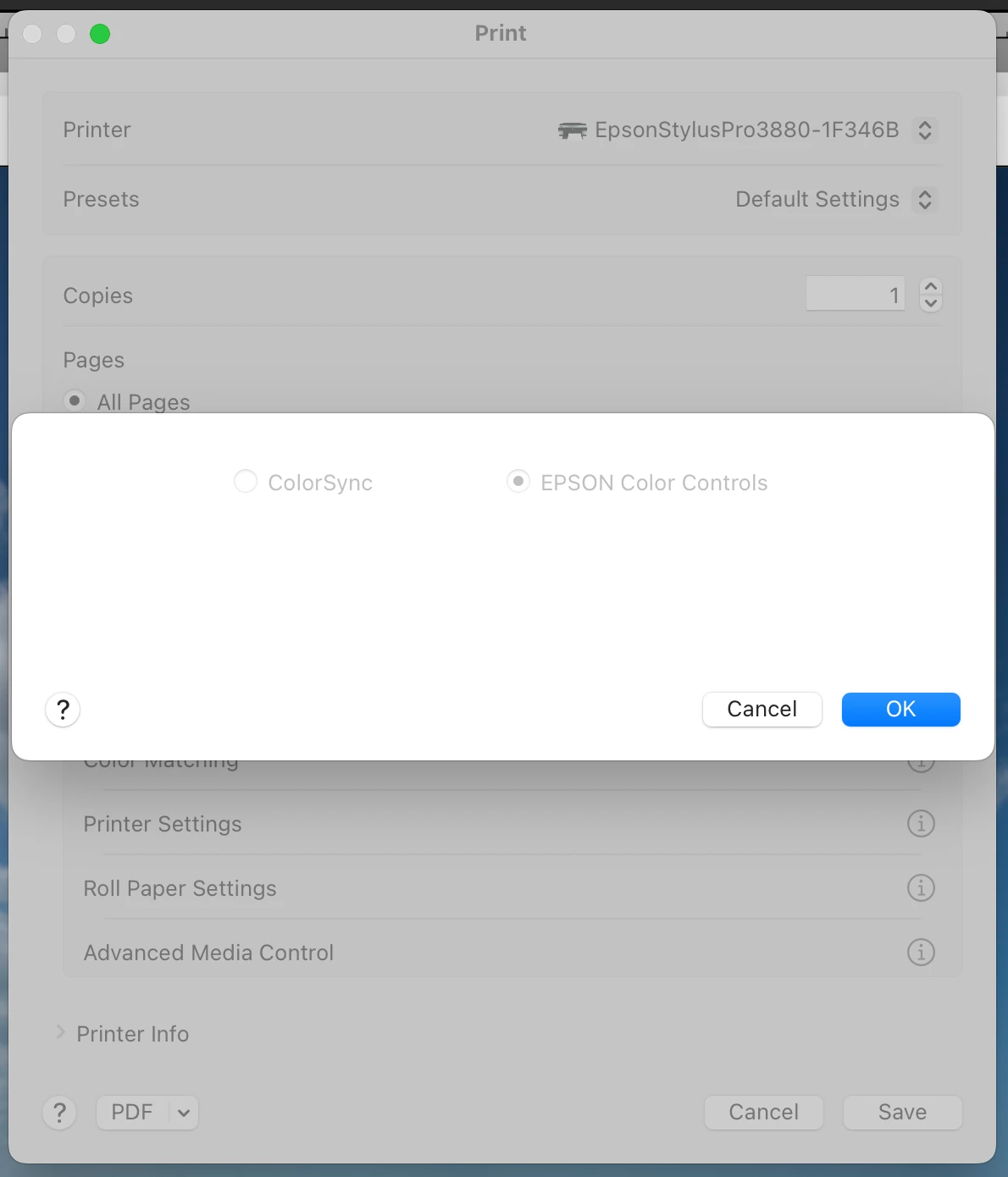 • Press the OK button to close the dialog and save your choices. NEVER use the Cancel button if you are checking that the options are what you want. Cancel does not leave the settings unchanged. Cancel RESETS the options to the default values, which in this case is not what I wanted. This seems to be an Epson print driver problem, but whatever. Just don't press the Cancel button.
