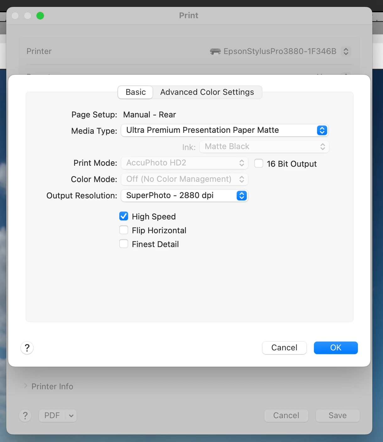• Notice other options that are greyed out & not changeable. In this case, the Ink is set to Matte Black, which is correct. The Print Mode is set to AccuPhoto HD2. Color Mode is set to Off (No Color Management). All these are correct for the case of having Lightroom use an ICC profile when printing, instead of having it all Managed by Printer.