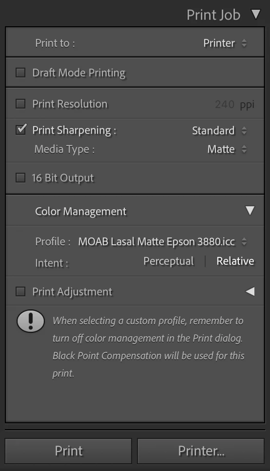 • In the Color Management section, change the Profile to the ICC profile matching the paper you are printing to. In my case, I'm using the generic profile from Moab for the Lasal Matte paper for the Epson 3880 printer.
