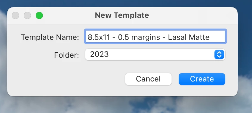 • In the lefthand drawer of the Print Module is a Template Browser panel. In the title bar of that panel are - and + button. Press the + button to bring up the New Template dialog.