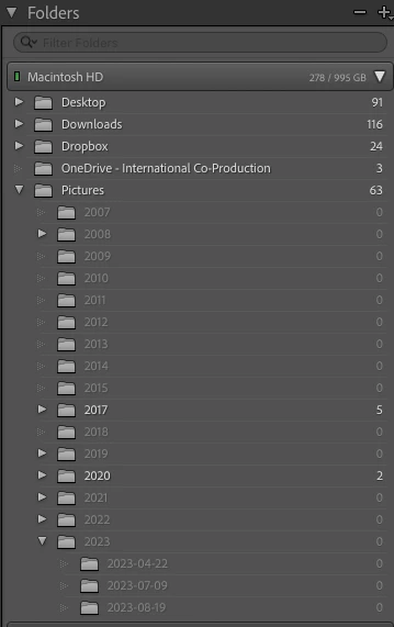 Even more puzzling - when I examine Mac Finder, I see all the 'missing' images still on my Mac inside Pictures/2023, where they previously resided safely in their original subolders. But when I look inside LR, they are not visible in the Pictures/2023 folder, nor are the subfolders.